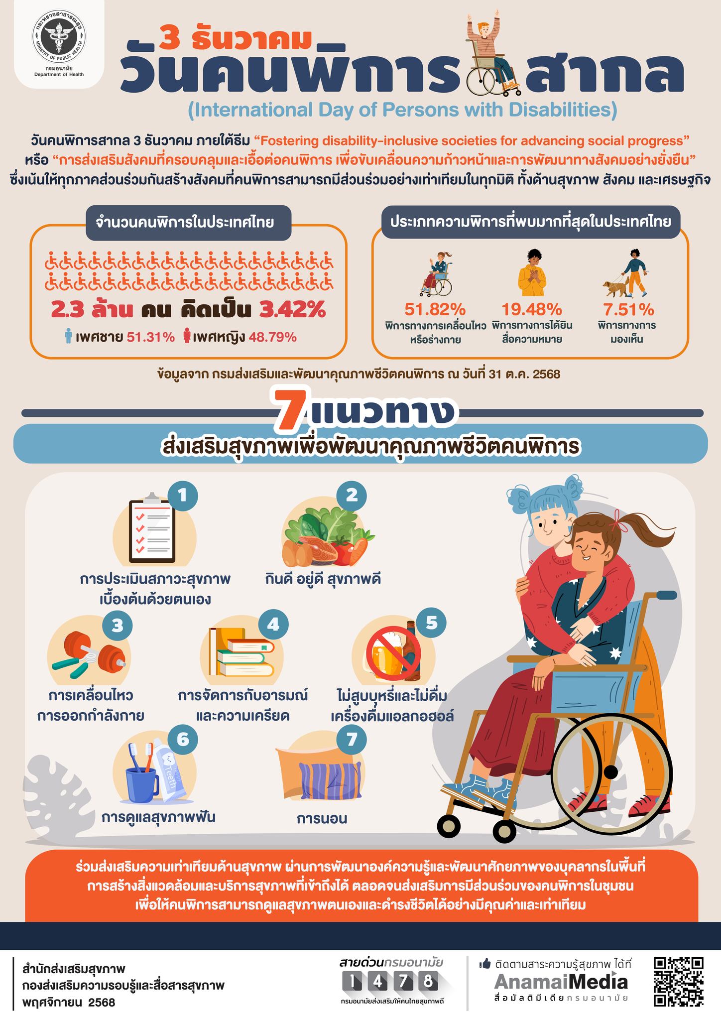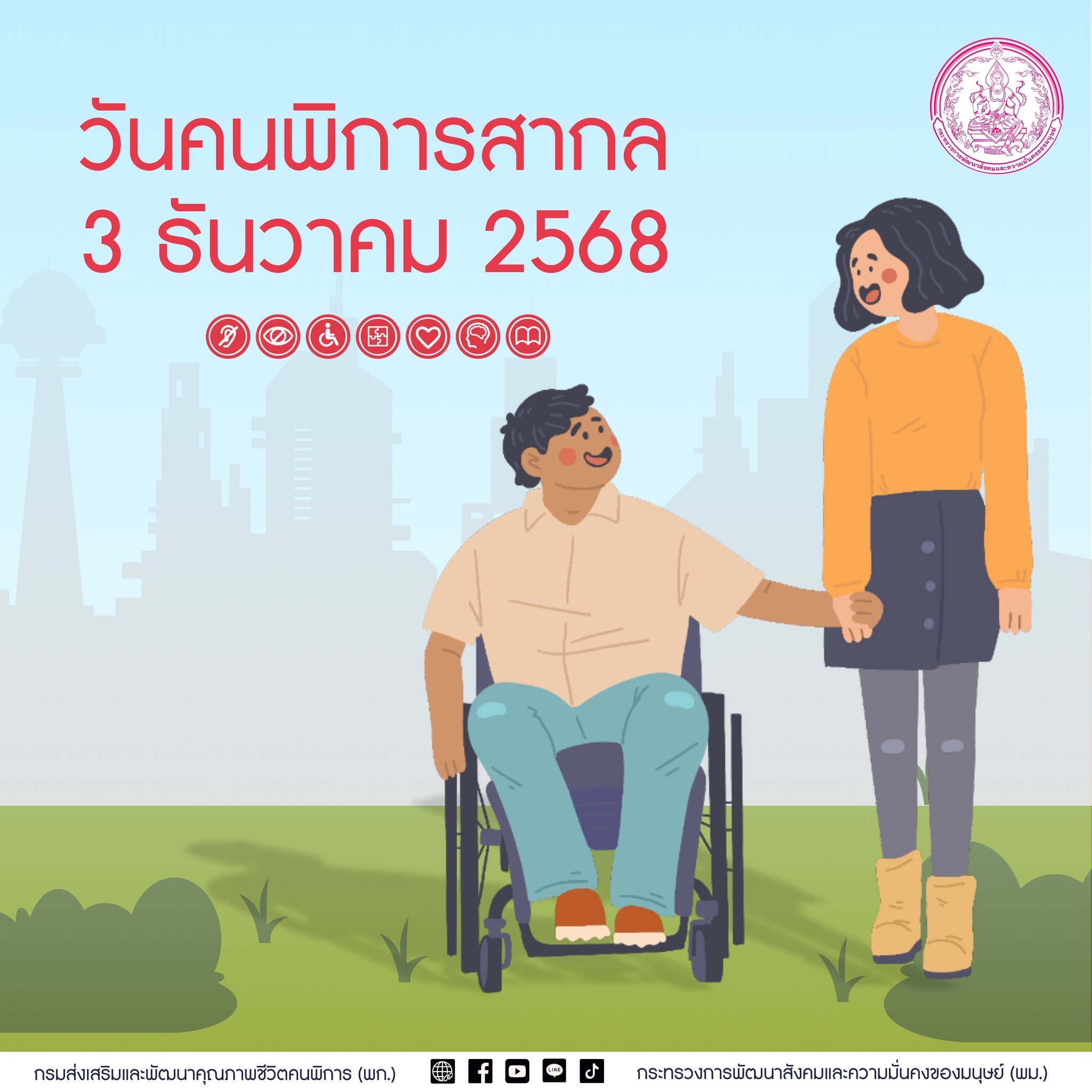 ด้วยองค์การสหประชาชาติ ได้ประกาศให้วันที่ 3 ธันวาคมของทุกปี เป็นวันคนพิการสากล และเชิญชวนให้ประเทศสมาชิกร่วมกันจัดกิจกรรมเฉลิมฉลองในรูปแบบต่างๆ เพื่อร่วมกันยกระดับความตระหนักรู้และส่งเสริมสิทธิคนพิการในทุกภูมิภาคของโลก ซึ่งประเทศไทยในฐานะสมาชิกองค์การสหประชาชาติ ได้ให้ความสำคัญในการจัดงานวันคนพิการสากลมาอย่างต่อเนื่อง โดยในปี 2568 องค์การสหประชาชาติได้กำหนดประเด็นหลัก คือ “การส่งเสริมสังคมที่ครอบคลุมและเอื้อต่อคนพิการ เพื่อขับเคลื่อนความก้าวหน้าและการพัฒนาทางสังคมอย่างยั่งยืน” (Fostering disability inclusive societies for advancing social progress)