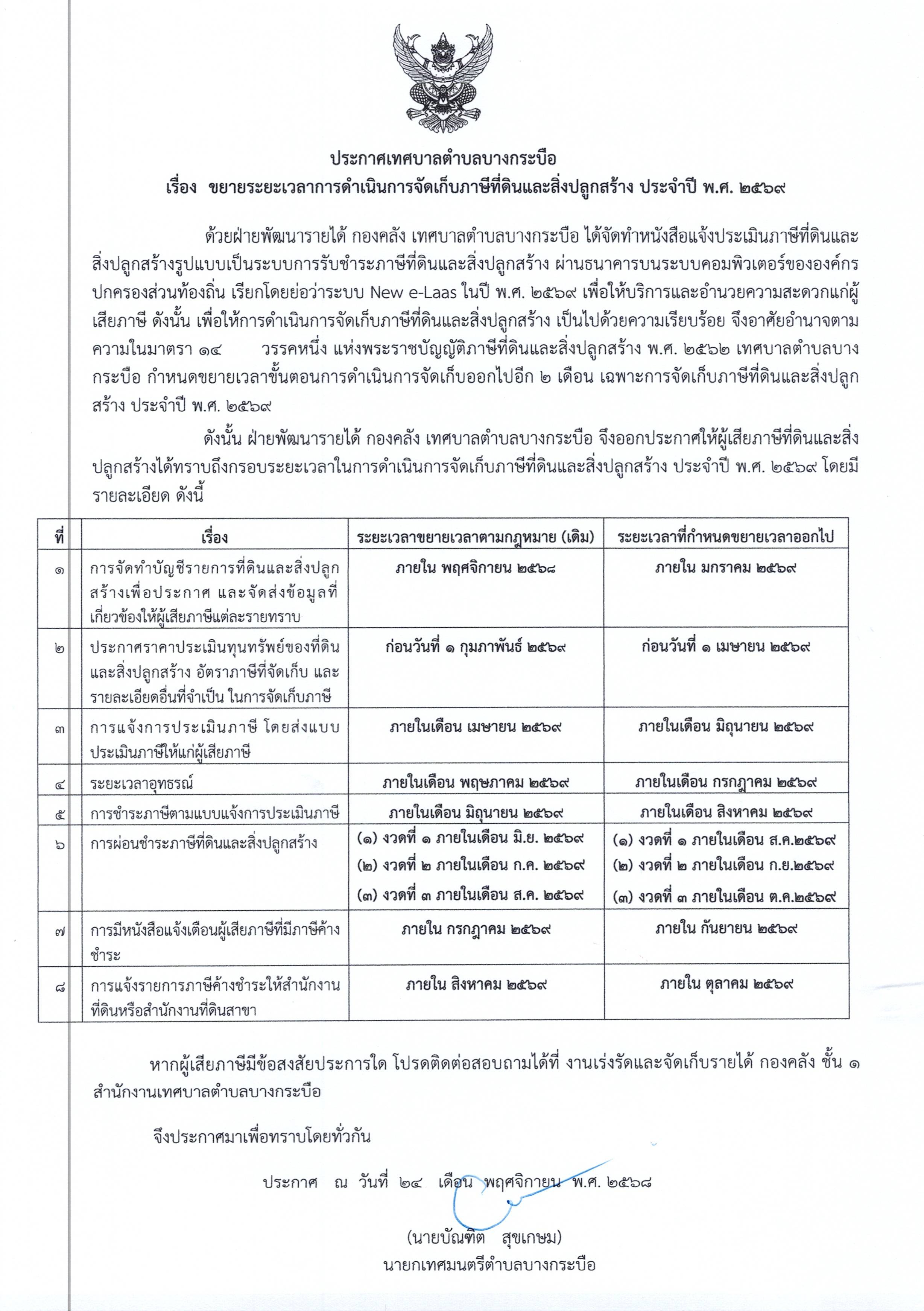 ประกาศเทศบาลตำบลบางกระบือ เรื่อง ขยายระยะเวลาการดำเนินการจัดเก็บภาษีที่ดินและสิ่งปลูกสร้าง ประจำปี พ.ศ.2569