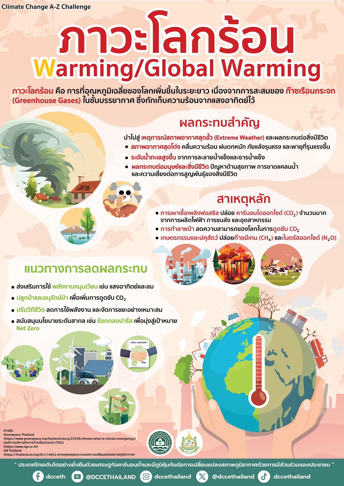 Climate Change A-Z Challenge ภาวะโลกร้อน (Warming/Global Warming) ภาวะโลกร้อน คือ การที่อุณหภูมิเฉลี่ยของโลกเพิ่มขึ้นในระยะยาว เนื่องจากการสะสมของ ก๊าซเรือนกระจก (Greenhouse Gases) ในชั้นบรรยากาศ ซึ่งกักเก็บความร้อนจากแสงอาทิตย์ไว้ สาเหตุหลัก •การเผาเชื้อเพลิงฟอสซิล ปล่อย คาร์บอนไดออกไซด์ (CO₂) จำนวนมาก จากการผลิตไฟฟ้า การขนส่ง และอุตสาหกรรม •การทำลายป่า ลดความสามารถของโลกในการดูดซับ CO₂ •เกษตรกรรมและปศุสัตว์ ปล่อยก๊าซมีเทน (CH₄) และไนตรัสออกไซด์ (N₂O) ผลกระทบสำคัญ นำไปสู่ เหตุการณ์สภาพอากาศสุดขั้ว (Extreme Weather) และผลกระทบต่อสิ่งมีชีวิต •สภาพอากาศสุดโต่ง คลื่นความร้อน ฝนตกหนัก ภัยแล้งรุนแรง และพายุที่รุนแรงขึ้น •ระดับน้ำทะเลสูงขึ้น จากการละลายน้ำแข็งและธารน้ำแข็ง •ผลกระทบต่อมนุษย์และสิ่งมีชีวิต ปัญหาด้านสุขภาพ การขาดแคลนน้ำ และความเสี่ยงต่อการสูญพันธุ์ของสิ่งมีชีวิต แนวทางการลดผลกระทบ •ส่งเสริมการใช้ พลังงานหมุนเวียน เช่น แสงอาทิตย์และลม •ปลูกป่าและอนุรักษ์ป่า เพื่อเพิ่มการดูดซับ CO2 •ปรับวิถีชีวิต ลดการใช้พลังงาน และจัดการขยะอย่างเหมาะสม •สนับสนุนนโยบายระดับสากล เช่น ข้อตกลงปารีส เพื่อมุ่งสู่เป้าหมาย Net Zero อ้างอิง - Greenpeace Thailand (https://www.greenpeace.org/.../climate-what-is-climate.../) - องค์การบริหารจัดการก๊าซเรือนกระจก (TGO) (https://www.tgo.or.th) - UN Thailand (https://thailand.un.org/th/174652-สาเหตุและผลกระทบของการเปลี่ยนแปลงสภาพภูมิอากาศ) "ประเทศไทยเติบโตอย่างยั่งยืนด้วยเศรษฐกิจคาร์บอนต่ำและมีภูมิคุ้มกันต่อการเปลี่ยนแปลงสภาพภูมิอากาศด้วยการมีส่วนร่วมของประชาชน" #กรมการเปลี่ยนแปลงสภาพภูมิอากาศและสิ่งแวดล้อม #DCCE
