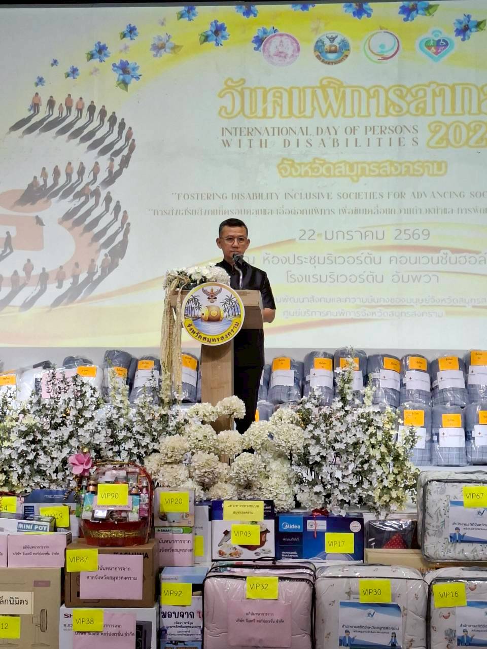 วันที่ 22 มกราคม 2569 พม.สมุทรสงคราม ดำเนินการจัดงานวันคนพิการสากลจังหวัดสมุทรสงคราม ประจำปี 2568 “การส่งเสริมสังคมที่ครอบคลุมและเอื้อต่อคนพิการ เพื่อขับเคลื่อนความก้าวหน้าและการพัฒนาทางสังคมอย่างยั่งยืน” โดยได้รับเกียรติจากนายชยชัย แสงอินทร์ ผู้ว่าราชการจังหวัดสมุทรสงคราม เป็นประธานเปิดงานฯ นางสาวณัฏฐ์ทิตา พัชรกุลเขมศิริ พัฒนาสังคมและความมั่นคงของมนุษย์จังหวัดสมุทรสงคราม กล่าวรายงาน พร้อมด้วย นายรนัสถ์ชัย พุ่มเจริญ รองผู้ว่าราชการจังหวัดสมุทรสงคราม และนางณัฐสุดา วงษ์สุวรรณ รองนายกเหล่ากาชาดจังหวัด หัวหน้าส่วนราชการจังหวัด อำเภอ สถานประกอบการ องค์กรชมรม และสมาคมคนพิการ ร่วมสนับสนุนการจัดงาน กิจกรรมสำคัญภายในงาน ประกอบด้วย 1) การมอบใบประกาศเกียรติคุณ - แสดงความยินดีแก่ผู้นำคนพิการที่สร้างแรงบันดาลใจ -หน่วยงานที่เป็นตัวอย่างที่ดีในการจัดสิ่งอำนวยความสะดวกสำหรับคนพิการและคนทุกวัย - สถานประกอบการที่สนับสนุนการจ้างงานคนพิการ/ให้สัมปทานพื้นที่ประกอบอาชีพแก่คนพิการ หรือผู้ดูแลคนพิการ 2) การมอบป้ายสนับสนุนเงินให้แก่องค์กรปกครองส่วนท้องถิ่น ตามโครงการปรับสภาพแวดล้อมที่อยู่อาศัยสำหรับคนพิการ 3) การมอบสามล้อโยกสำหรับคนพิการ 4) การแสดงศักยภาพของคนพิการ 5) การจับฉลากของขวัญของรางวัลแก่คนพิการ 6) การจัดแสดงผลิตภัณฑ์ของคนพิการและการจัดนิทรรศการของหน่วยงานที่เกี่ยวข้อง ผู้เข้าร่วมงาน ประกอบด้วย คนพิการ ผู้ดูแลคนพิการ หน่วยงานภาครัฐ/ภาคเอกชน องค์กรด้านคนพิการ อาสาสมัครพัฒนาสังคมและความมั่นคงของมนุษย์ (อพม.) และภาคีเครือข่ายที่เกี่ยวข้อง รวมทั้งสิ้น 400 คน ณ โรงแรมริเวอร์ตัน ตำบลลาดใหญ่ อำเภอเมือง จังหวัดสมุทรสงคราม